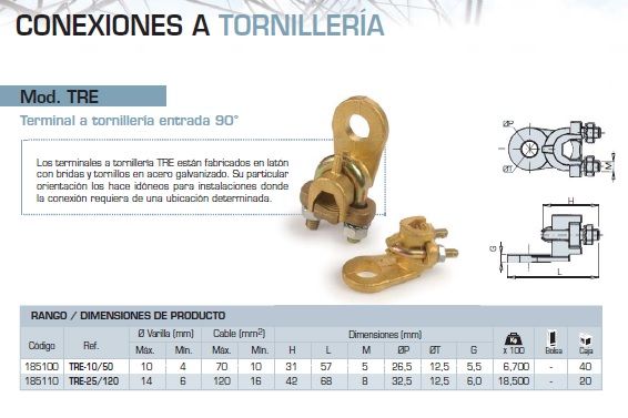 TERMINAL A TORNILLERIA TRE-10/50 90 GRADOS PARA CONEXION ACODADA FABRICADOS EN LATON CON ACABADO COBREADO PARA MEJORAR LA CONEXION ELECTRICA