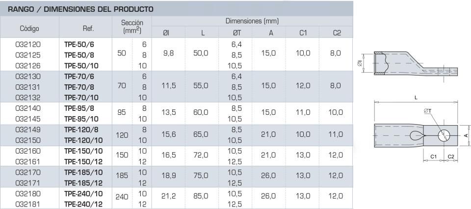 TERMINAL DE COBRE DE PALA ESTRECHA PARA CABLE DE 50 mm2 EN METRICA 10